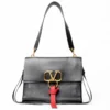 Borsa firmata Valentino, modello VRing, misura medium, realizzata in pelle nella colorazione nera con hardware dorato. Dotata di una patta frontale con chiusura ad incastro, internamente rivestita in pelle tono su tono e presenta comode tasche, la borsa è abbastanza capiente. Munita di un manico superiore in pelle per una comoda portata a spalla. Sulla parte frontale presenta il classico logo ”V” del brand in metallo dorato. L’articolo si presenta in ottime condizioni.